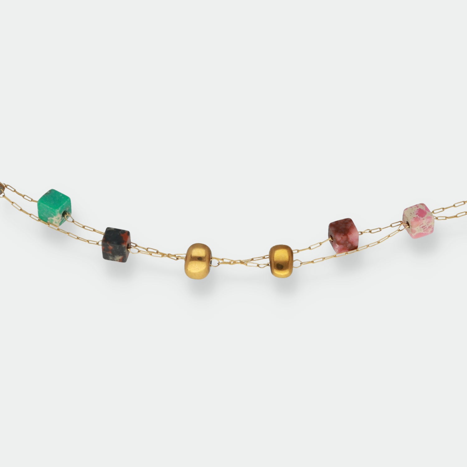 Deslumbra con nuestro collar doble de acero quirúrgico, nácar y piedras naturales.Este impresionante collar combina la elegancia del acero quirúrgico con la delicadeza del nácar y la belleza de las piedras naturales.Con un diseño versátil de doble cadena, este collar agrega un toque de sofisticación a cualquier atuendo.Las piedras naturales aportan un aspecto único y auténtico.Explora nuestra colección y elige el collar doble perfecto para realzar tu estilo personal.¡Compra ahora y luce con confianza nuestro collar de acero quirúrgico, nácar y piedras naturales!